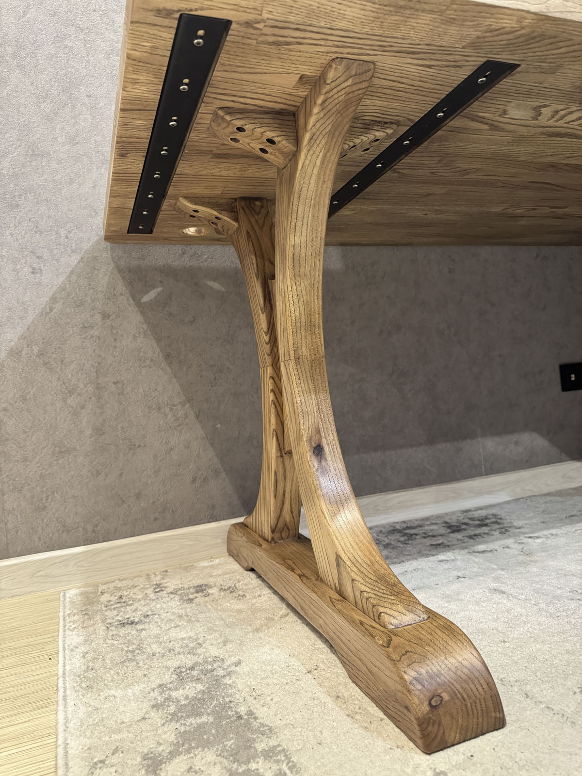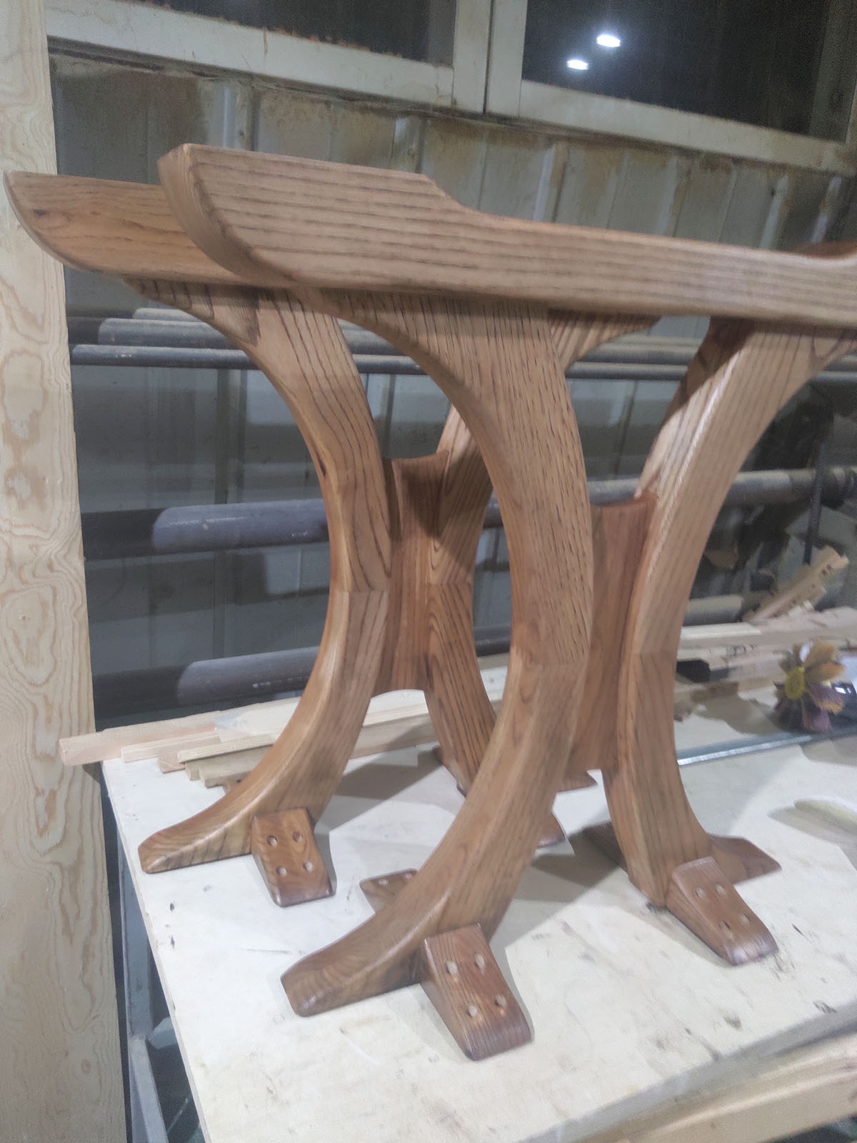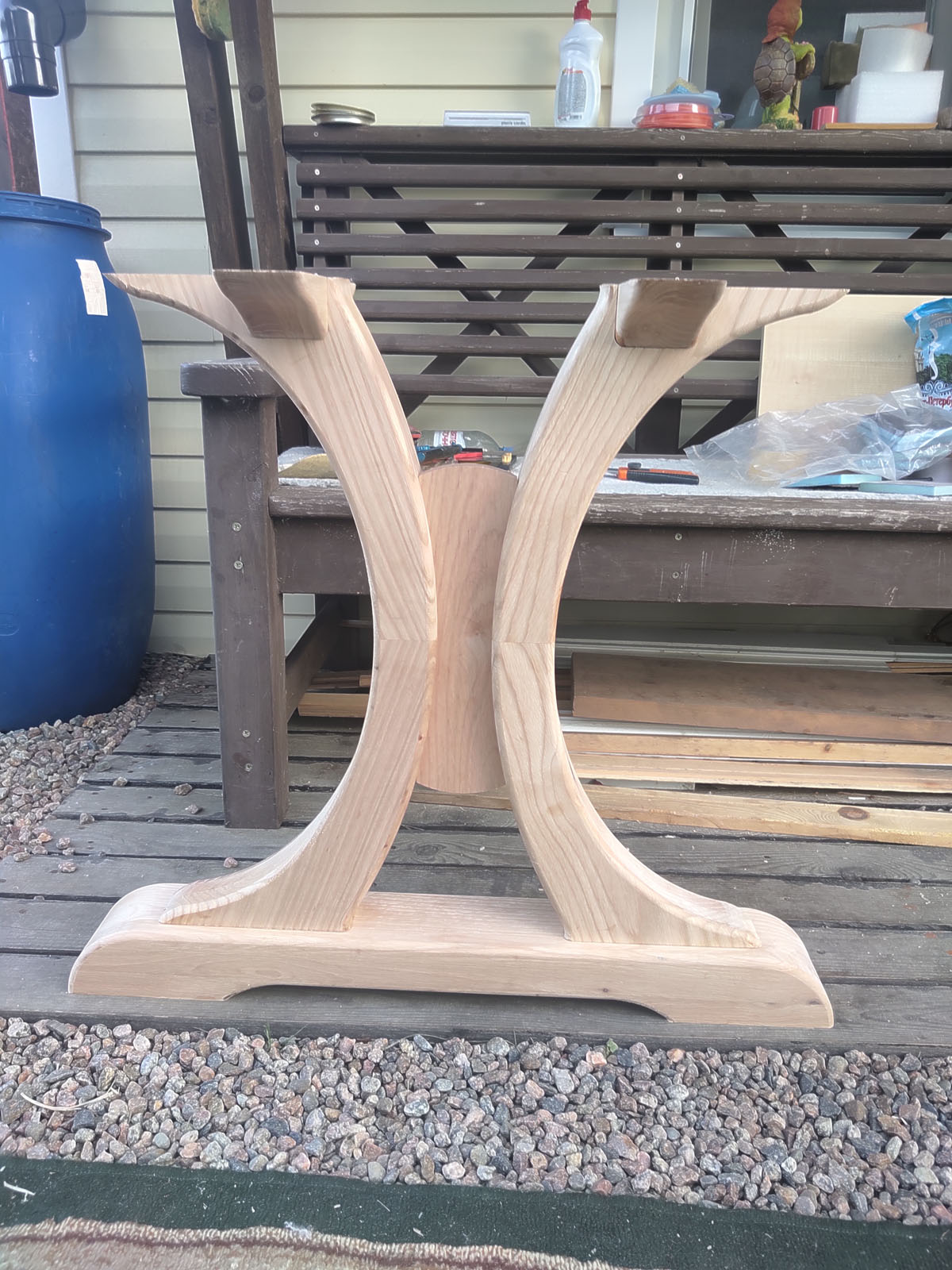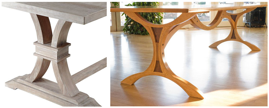 Но спустя несколько месяцев она попросила меня придумать какие-либо ножки для стола, или найти подходящее подстолье. Я предложил купить модерновое металлическое подстолье, которых сейчас много есть в продаже. Однако ей всё не нравилось. Она хотела что-то не сильно сложное, и нашла пару фото того, чего бы ей хотелось, только без царг и перекладин («Скажите, а такого же, только без крыльев, у вас нету?»). Это оказался ключевой фактор!