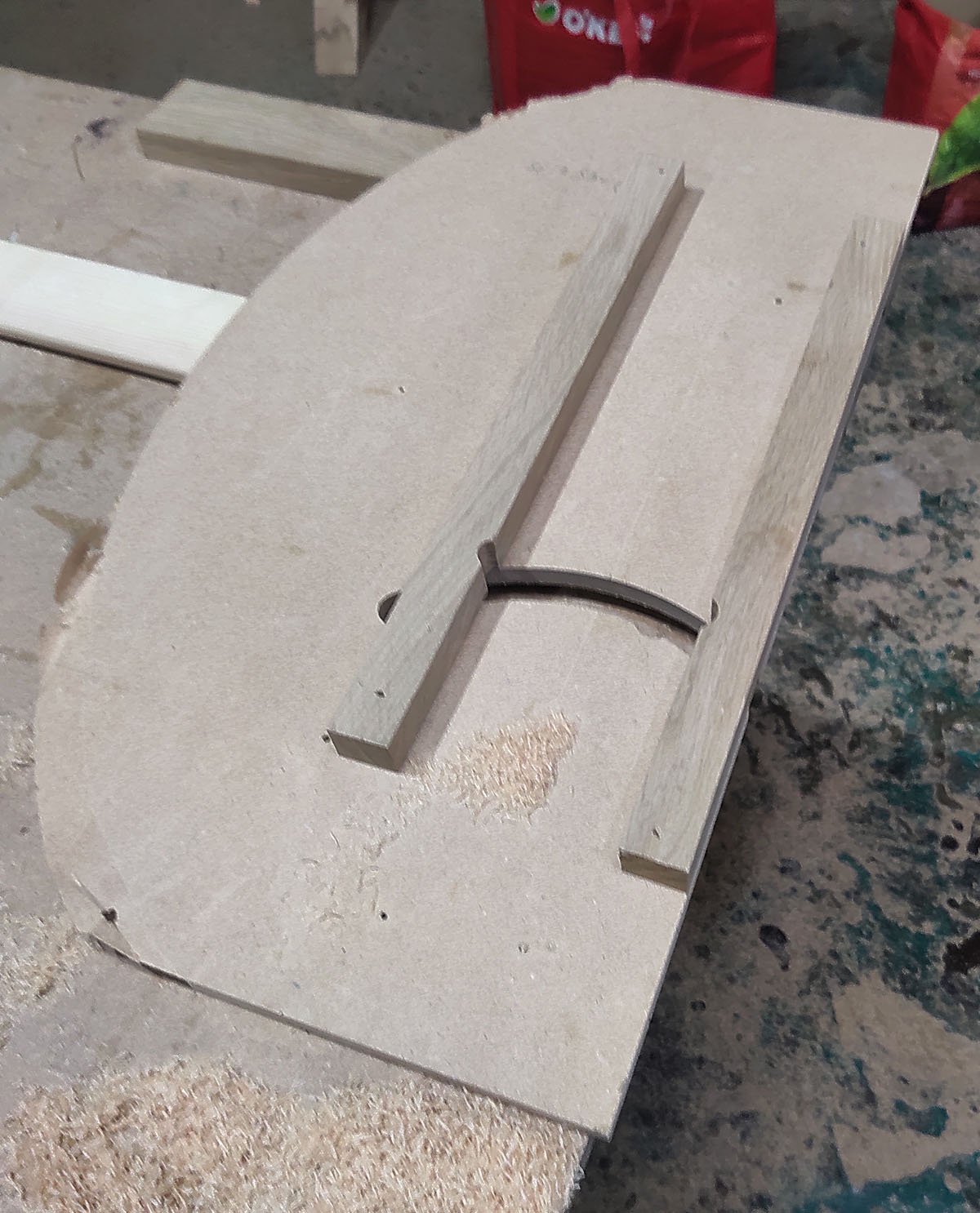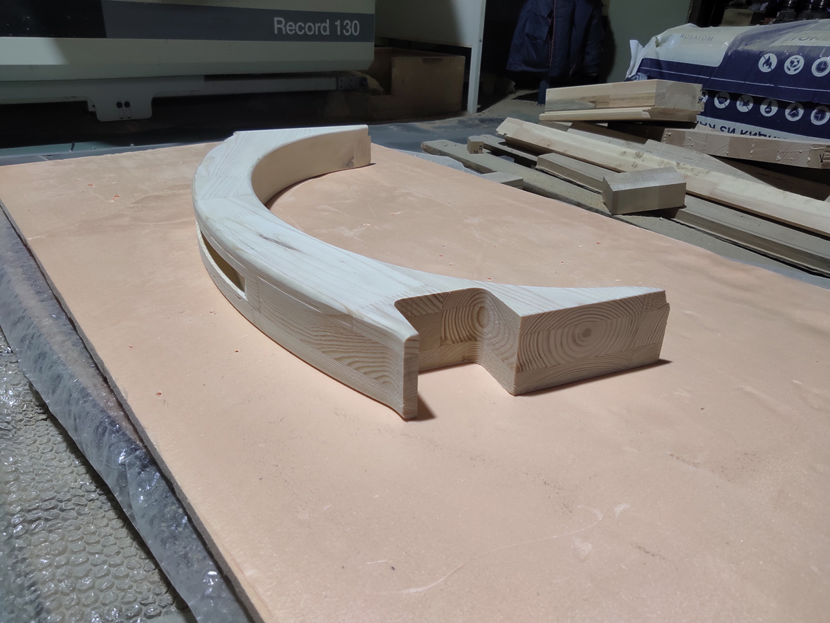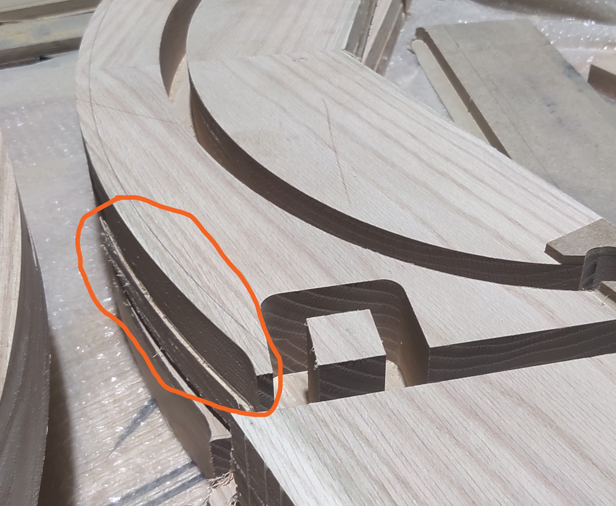 Одна из деталей вышла с браком. Во время отрезания лишнего материала на тыльной части заготовки, один обрезок отскочил и ударил по заготовке, и она сдвинулась в прижимах на несколько миллиметров. Когда я заметил это, то по верхнему проходу уже шла чистовая фреза и поэтому получилась ступенька. Я потом сделал шаблон, нарастил деталь шпоном и по шаблону сделал правильный профиль.