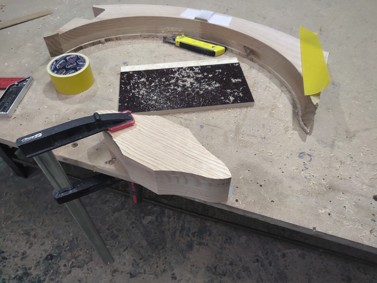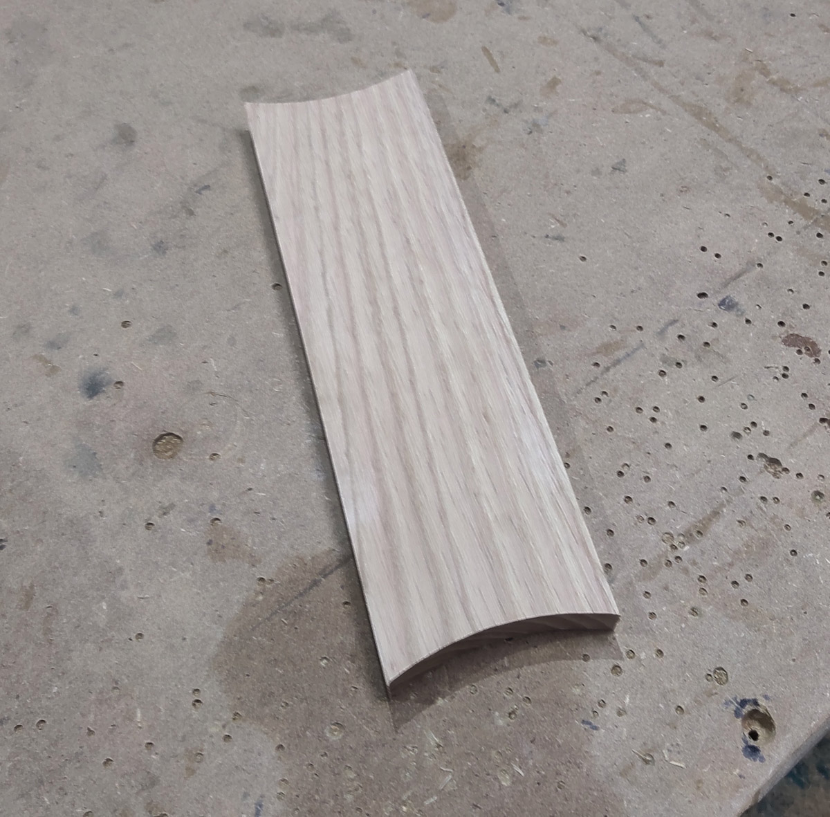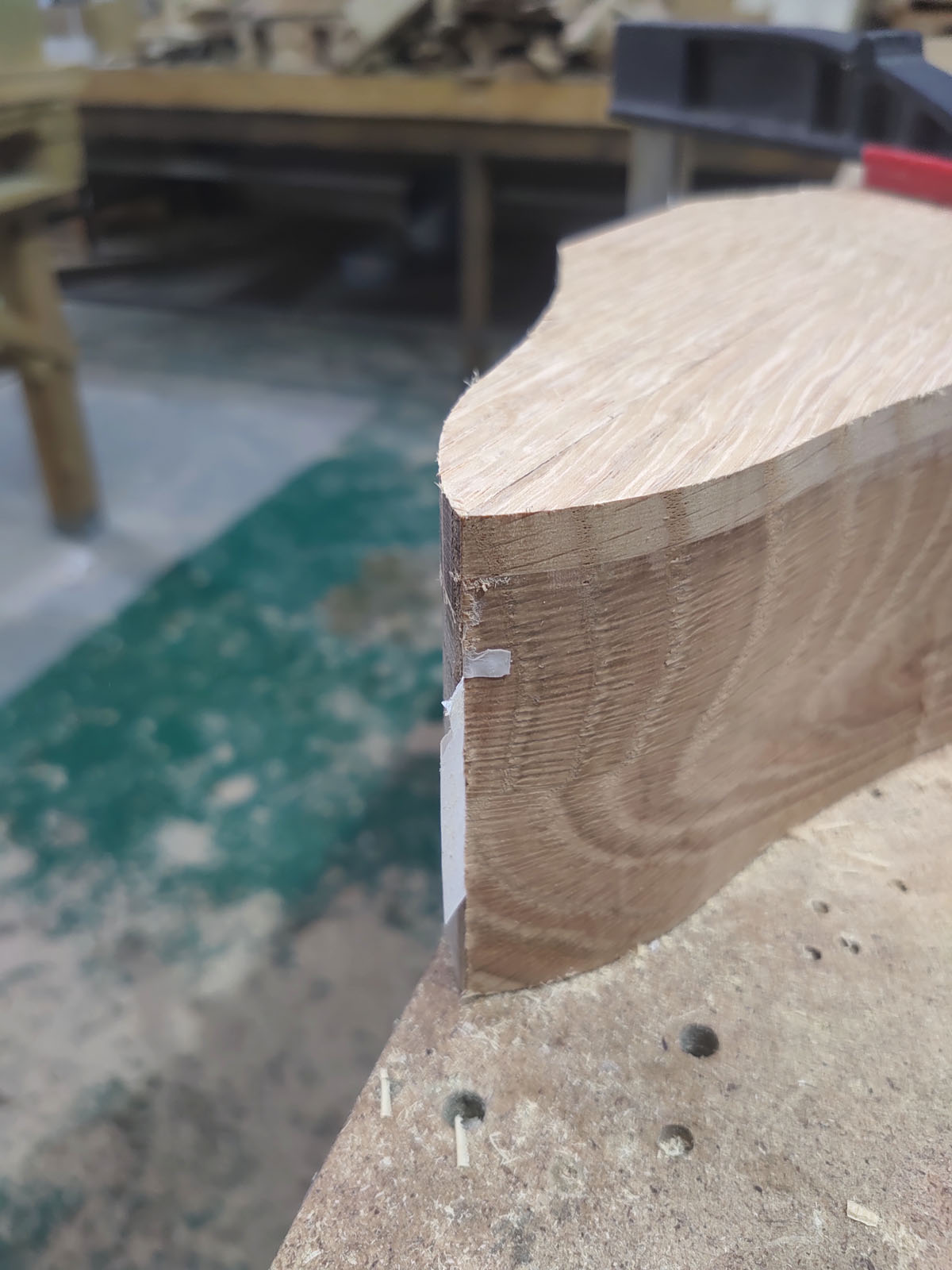 Одна из деталей вышла с браком. Во время отрезания лишнего материала на тыльной части заготовки, один обрезок отскочил и ударил по заготовке, и она сдвинулась в прижимах на несколько миллиметров. Когда я заметил это, то по верхнему проходу уже шла чистовая фреза и поэтому получилась ступенька. Я потом сделал шаблон, нарастил деталь шпоном и по шаблону сделал правильный профиль.
