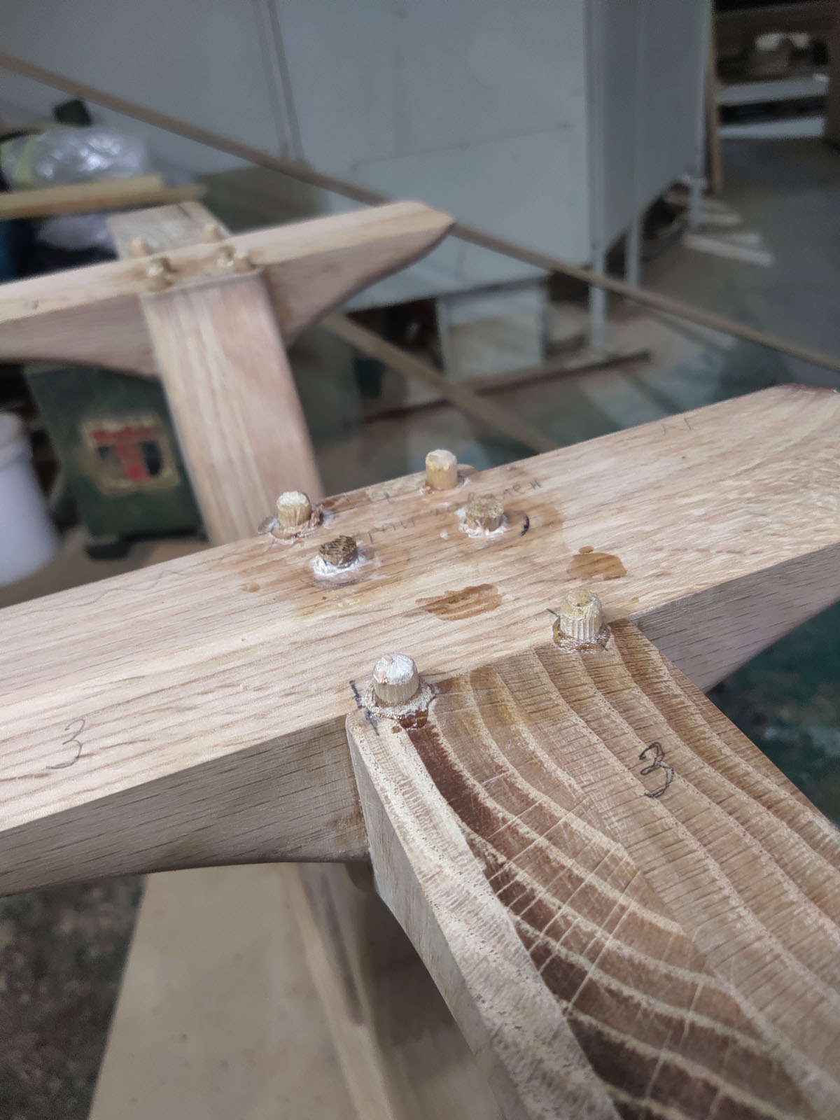 Так как стол проектировался без царг и связей между ногами в продольном направлении, то узел крепления к столешнице должен быть жёсткий и не допускать и малейших подвижек. Для укрепления узла установки консольки поставил шканты Ø10 мм. В шов шкатны поставлены в качестве шпонок от сдвига. А вот средние шканты должны были заходить в тело ноги и быть длиной около 100 мм. Такие шканты в магазине не продаются. Есть только круглые палочки, но они обычно там из сосны, а мне нужно было из дуба.