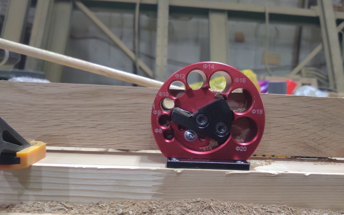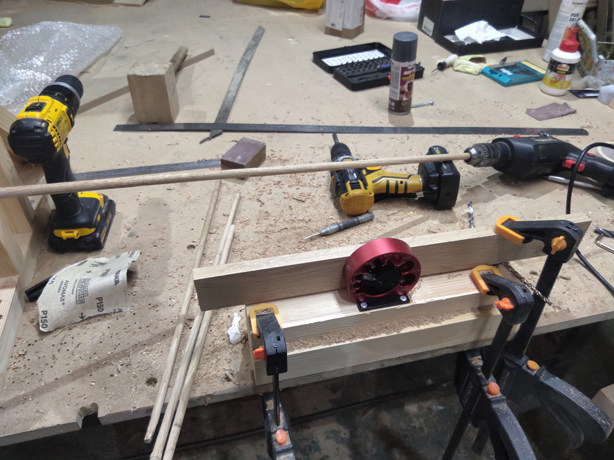 Что бы сделать длинные шканты купил приспособление для изготовления круглых палочек разного диаметра. Выпиливал брусочки 12х12 мм, и затем последовательно прогонял через приспособление, сначала Ø14 мм, потом 12 мм, и 10 мм. Длина заготовок была от 500 до 800 мм.