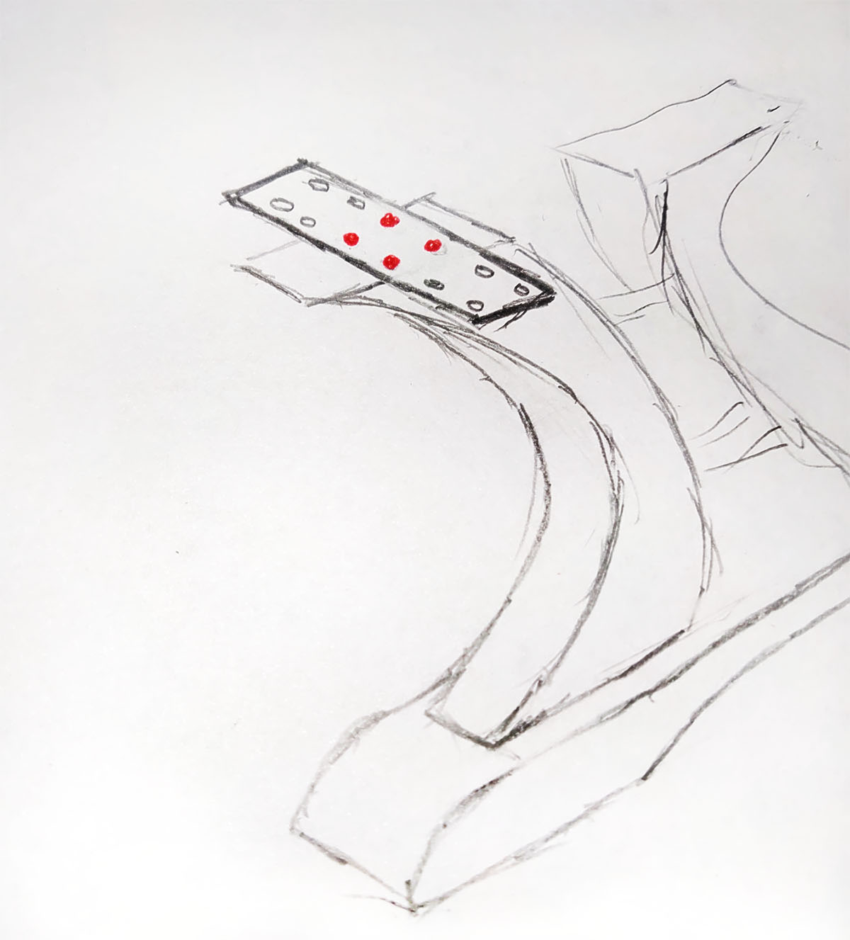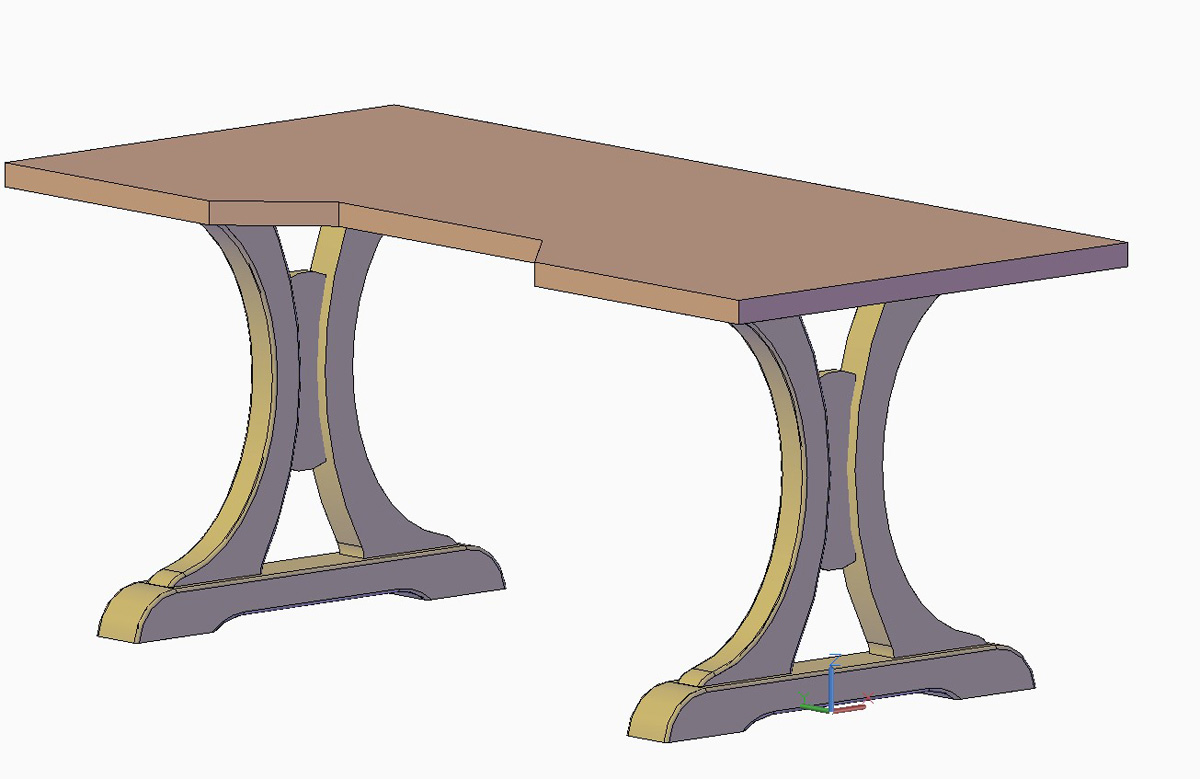 Придумывая дизайн и размышляя над конструкцией ножек, я долго не мог определится, как сделать достаточно жёсткое крепление к столешнице, так как она весит порядка 40 кг. В итоге родился вот такой дизайнерский рисунок. Жёсткость в поперечном направлении будет обеспечивать толстая стальная пластина, через которую нога будет крепиться к столешнице.