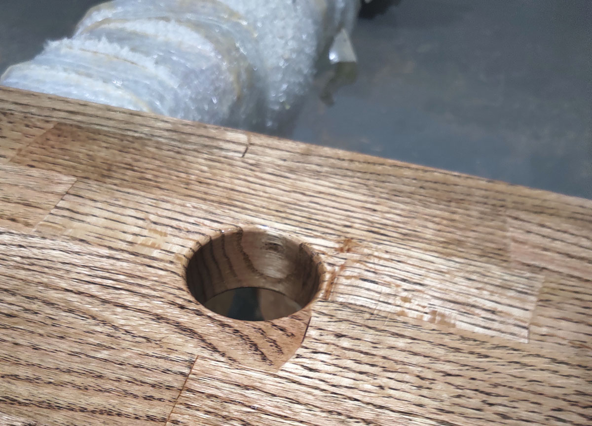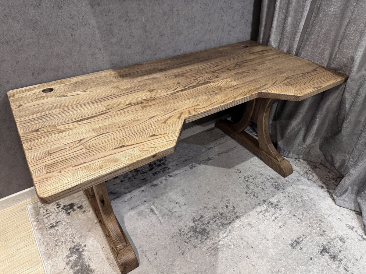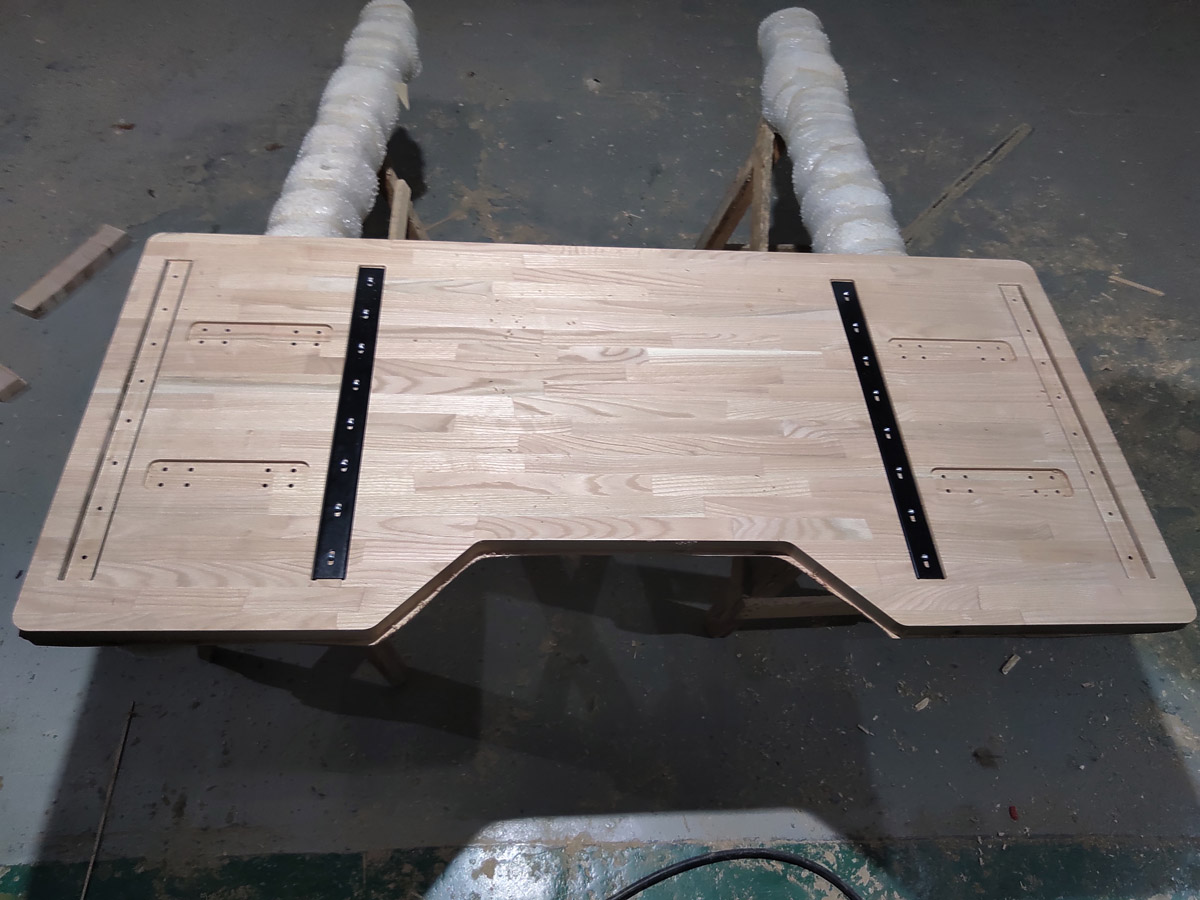 После контрольной сборки, я всё разобрал и подготовил все элементы для покрытия маслом. Так же в столешнице были выполнены отверстия для пропуска проводов к компьютеру.