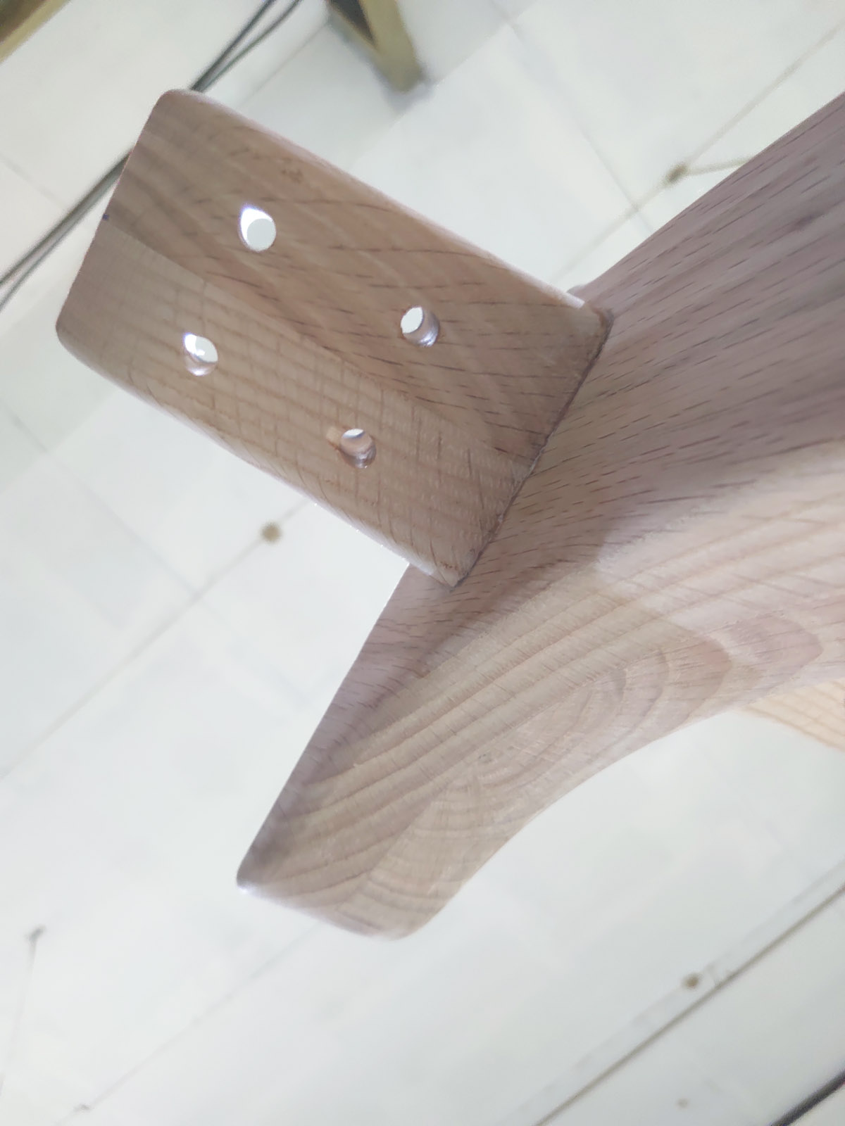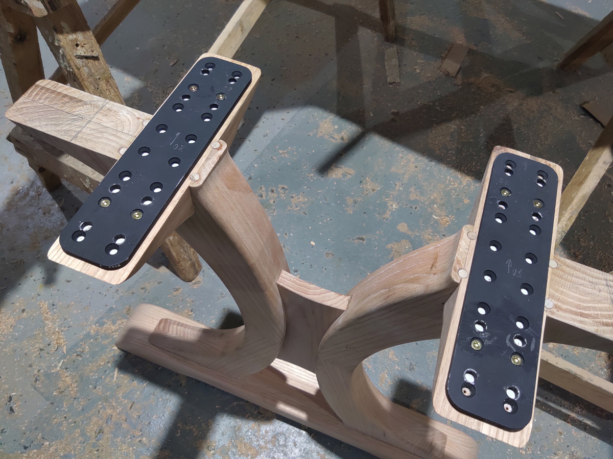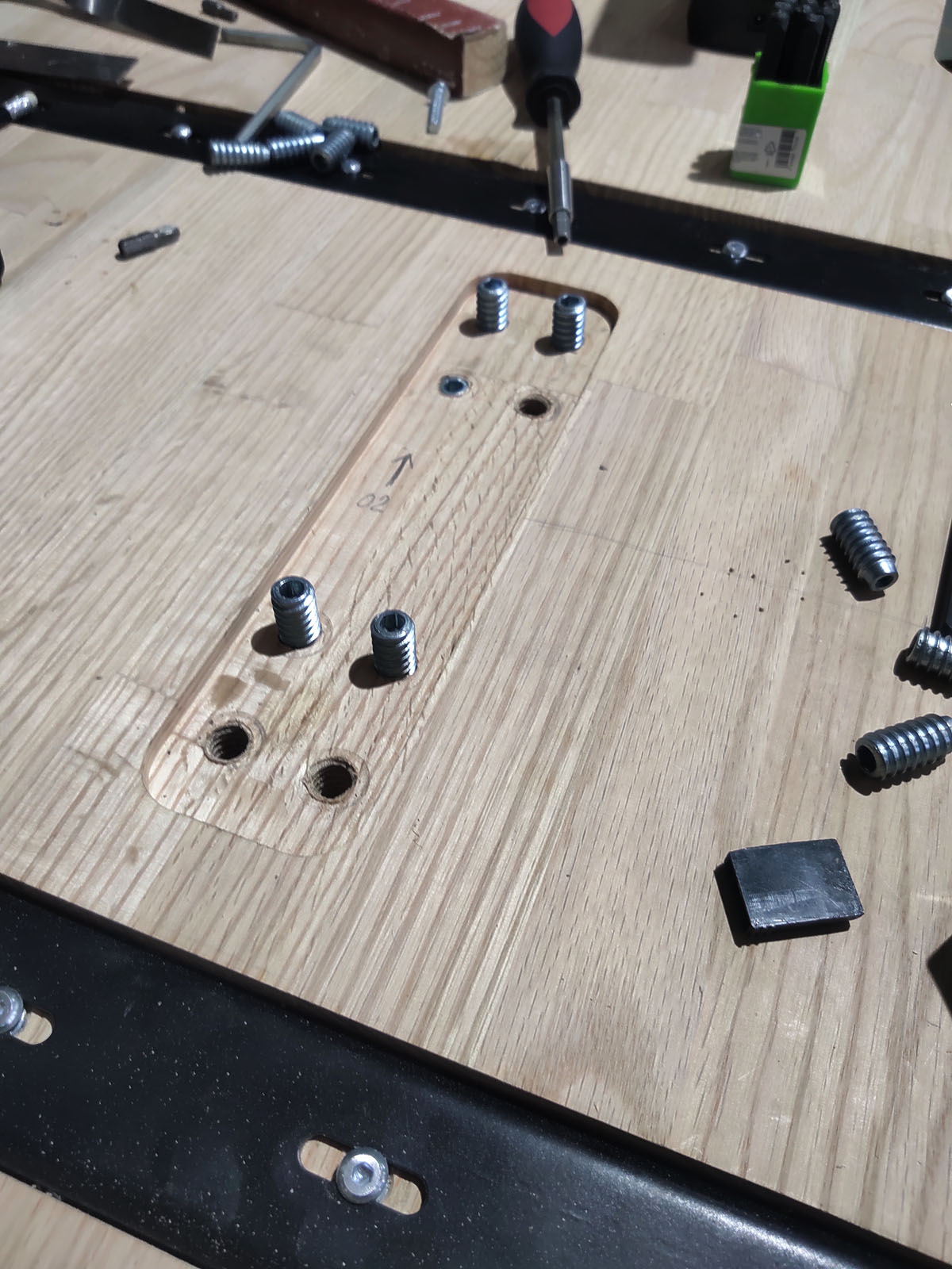 Пластины для крепления ног были немного дугой, пришлось из подправить и немного подшлифовать. По моему плану пластины крепятся к столешнице через футорки которые ввинчиваются в массив столешницы. Чтобы нога не имела подвижек, пластина должна быть очень точно выровнена относительно поверхности столешницы, при это сама пластина крепится к констолькам ноги и должна плотно опираться на все восемь футорок.