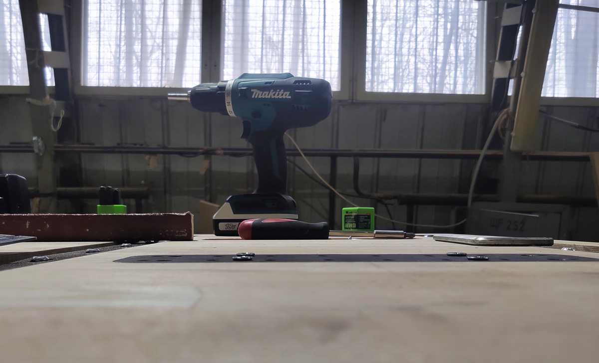 Когда все отверстия были готовы я окончательно прикрутил пластины к консолькам. Каждая пластина крепится шестнадцатью саморезами, и ноги готовы к креплению к столешнице. Поставил ноги на столешницу. Отверстия в пластине отлично совпали с футорками, и я прикрепил их на несколько винтов. Даже закрутив менее половины винтов, крепление получилось очень жёсткое, чего я и хотел.