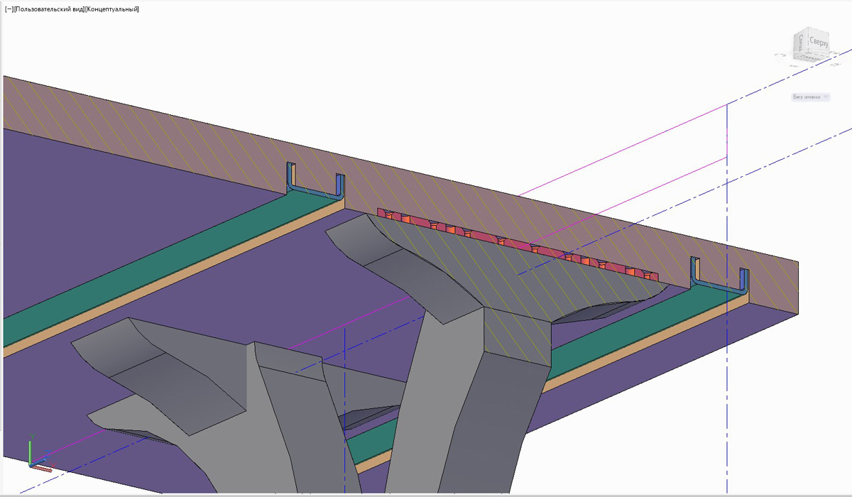 Дальше я взялся за детальную прорисовку того, что придумал. Пластину я прикрутил к поперечным консолям ноги, которые добавляют ещё жёсткости этому узлу. В столешнице пластина будет утоплена в нишу.