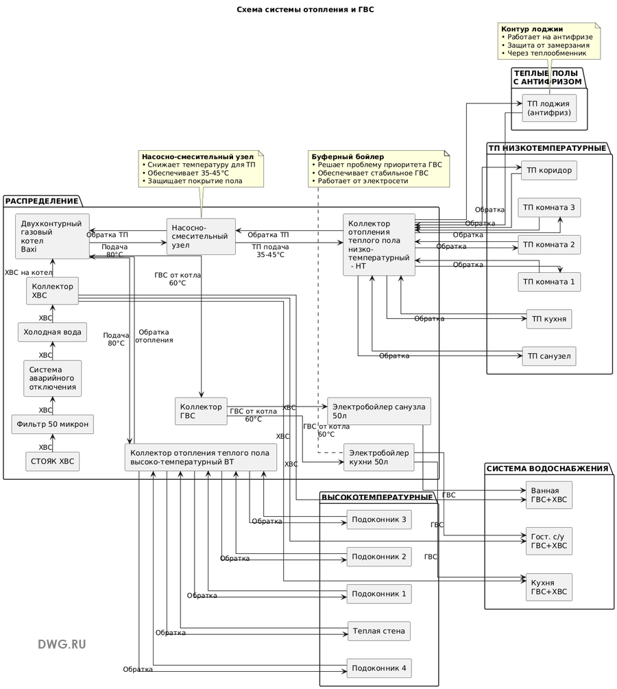 Задача: Разработать комплексный проект системы отопления и ГВС с последующей визуализацией для передачи монтажной бригаде.