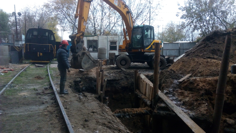 Глубина котлована 4м. Уровень грунтовых вод -3м. Расстояние до жд путей 500-700мм. "Шпунт" труба 219х6 с шагом 4м и деревянная забирка. Заглубление труб ниже дна котлована 2м. Откачка воды нон-стоп. На фотке последствия единичного проезда жд крана весом 60тонн(да-да на фотке видно еще и рабочего там в котловане). Хорошо что локомотив (100тонн) за ним не поехал. Обычно по этому пути ездят небольшие составы общим весом до 600тонн. Перевозят в том числе и токсичные грузы. В общем в одну сторону кран проехал, в другую его просто не пустили пока в срочном порядке это все не закопали.