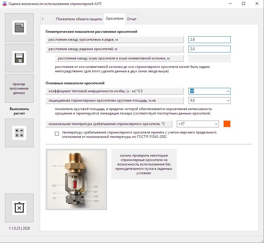 Программа позволяет выполнить оценку возможности использования спринклерной АУП согласно методике, изложенной в Приложении В СП 485.1311500.2020.